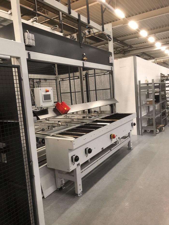 Für einen marktführenden Hersteller von Kunststofffenster-Hebeschiebetüren hat Junkerjürgen Maschinenbau einen Materialtransport gefertigt. In dieser Fertigungslinie werden die Kunststofffenster-Profile mit thermisch getrenntem Aluminiumkern als unbearbeitetes Rohteil in einen zweisträngigen Bearbeitungsbereich zugeführt. Dort werden die Kunststofffenster-Profile von Junkerjürgen Maschinenbau entwickelten CNC-Bearbeitungsautomaten ZBZ1 und ZBZ2 verschraubt und spanend bearbeitet. Nach der CNC-Bearbeitung werden die rechten und linken Teile mit einer Winkelübergabe paarweise zusammengeführt, mit einem hydraulischen Scherenhubtisch auf eine zweite Arbeitsebene angehoben und auf Zahnriementransporte gesammelt. Auf Anforderung der Maschinenbediener werden diese Paare der Fenster-Profile wahlweise an eine der drei manuellen Weiterbearbeitungsplätze ausgegeben.